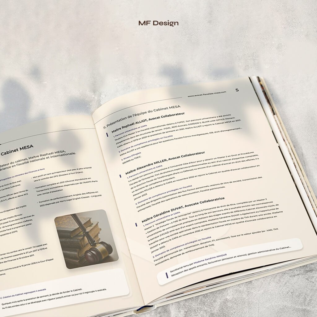 L’agence de communication MF Design a eu l’opportunité de collaborer avec le cabinet d’avocats fiscalistes « Cabinet Mesa » pour la réalisation d’un projet complet. Après avoir recréer le branding complet du cabinet, notre équipe créative s’est concentrée sur la création d’une brochure corporate qui reflète l’expertise et la réputation du cabinet. Nous avons veillé à ce que la brochure présente de manière claire et concise les services spécialisés en droit fiscal offerts par « Cabinet Mesa » et mette en valeur les compétences de l’équipe.
